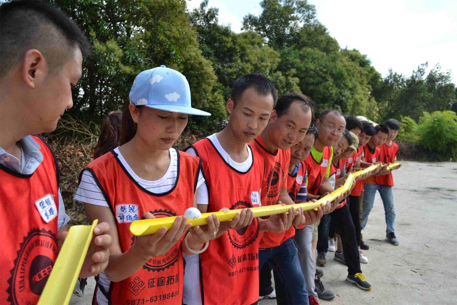 所有隊員一字排開,手持接力棒,在保證圓珠不掉落的情況下從教練指定的位置運珠到達終點。要有良好的工作心態和勇于接受挑戰的精神才能順利完成。充分體現團隊的領導力,溝通協調能力,工作的計劃與嚴謹性時間與效率的控制,資源的有效利用,及具備在規定時間內調動各種資源解決問題的能力。
