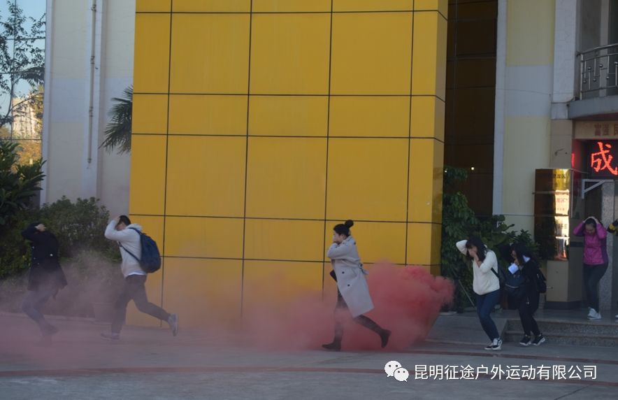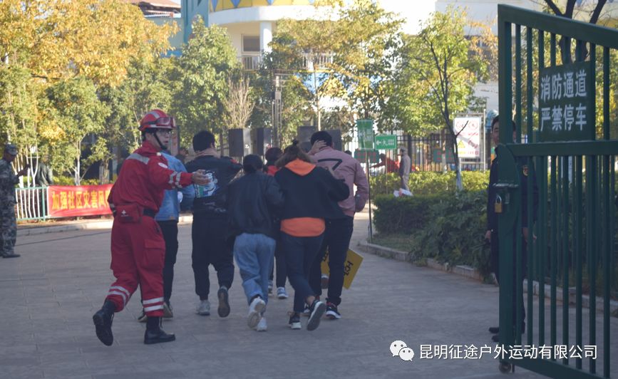 救災演練正式開始,模擬地震災害發生場景,昆明征途的教練們指導受“災群眾”在第一時間逃