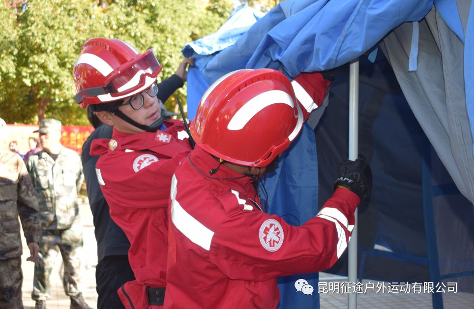 逃離完畢后教練在模擬救災現場,教學如何判斷受傷人員的受傷程度,如何幫助救援隊,如何搭建帳篷